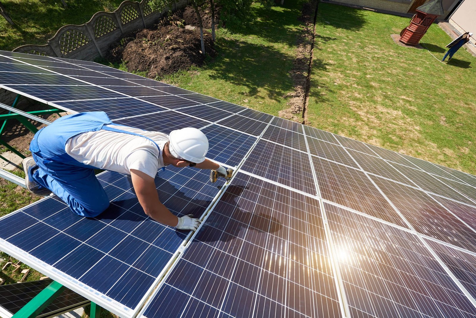Setting up solar panels and related equipment at residential, commercial, or industrial locations.